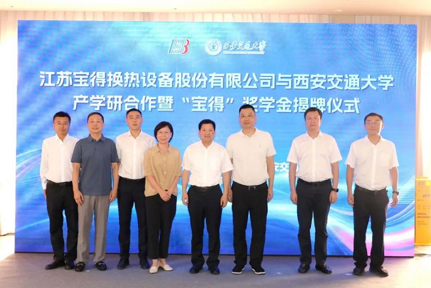 8月18日下午,江蘇寶得換熱設備股份有限公司與西安交通大學簽署產學研合作協議及“寶得”獎學金揭牌儀式在江陰成功舉行。