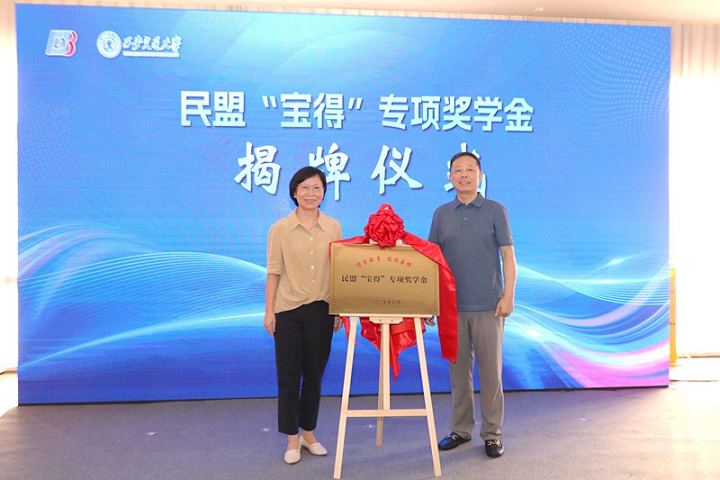 錢晴與奚龍為民盟“寶得”專項獎學金揭牌,突出項目在科研創新、人才培養與社會責任的多維價值。